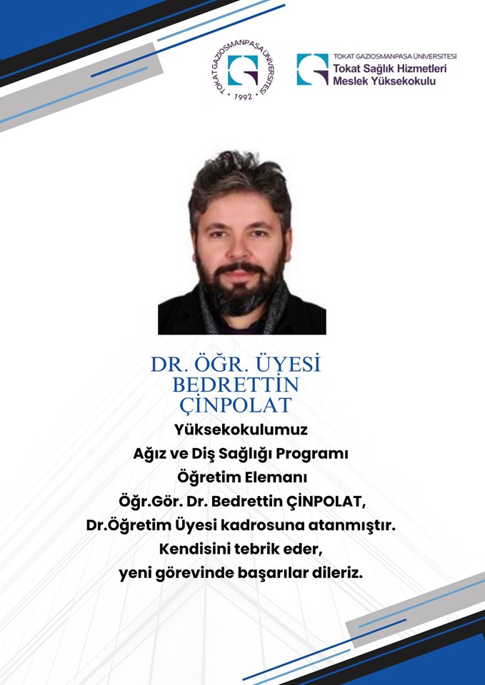 Yüksekokulumuz Ağız ve Diş Sağlığı Programı Öğretim Elemanı Öğr. Gör. Dr. Bedrettin ÇİNPOLAT, Dr. Öğretim Üyesi kadrosuna atanmıştır. Kendisini tebrik eder, yeni görevinde başarılar dileriz.